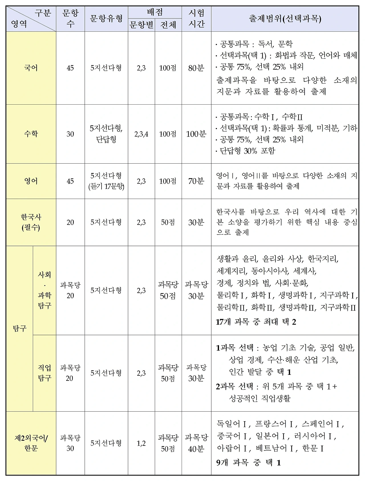 시험 구조는 다음과 같습니다. 각 과목별로 문항 수, 문제 유형, 총 점수, 시험 시간 등이 명시되어 있으며, 학생들은 이를 바탕으로 준비할 수 있습니다.