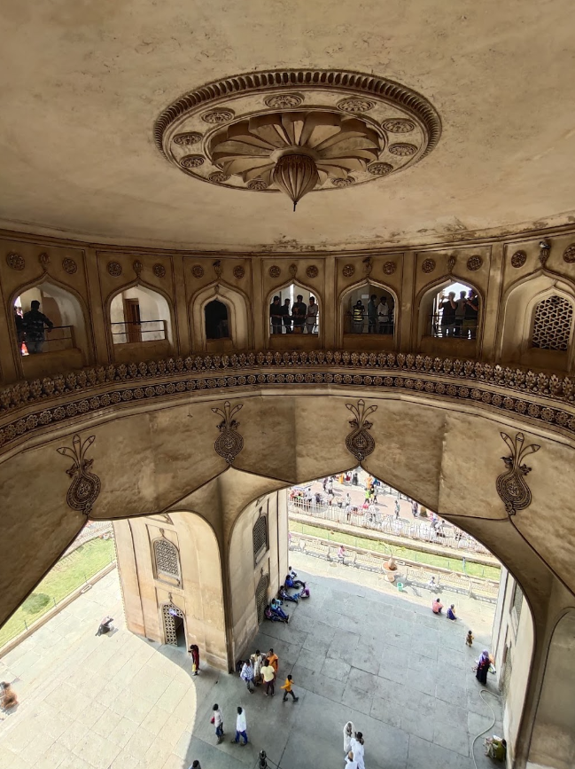 차르미나르의 천장도 주목할 만한데, 각종 섬세한 장식과 패턴이 세밀하게 새겨져 있습니다. 그 중에서도 가장 인상적인 부분은 차르미나르의 상단에 위치한 큰 돔입니다. 이 돔은 고대 건축물에서 종종 볼 수 있는 독특한 형태로, 건축의 기능적 아름다움과 함께 장식적 요소도 강조하고 있습니다.