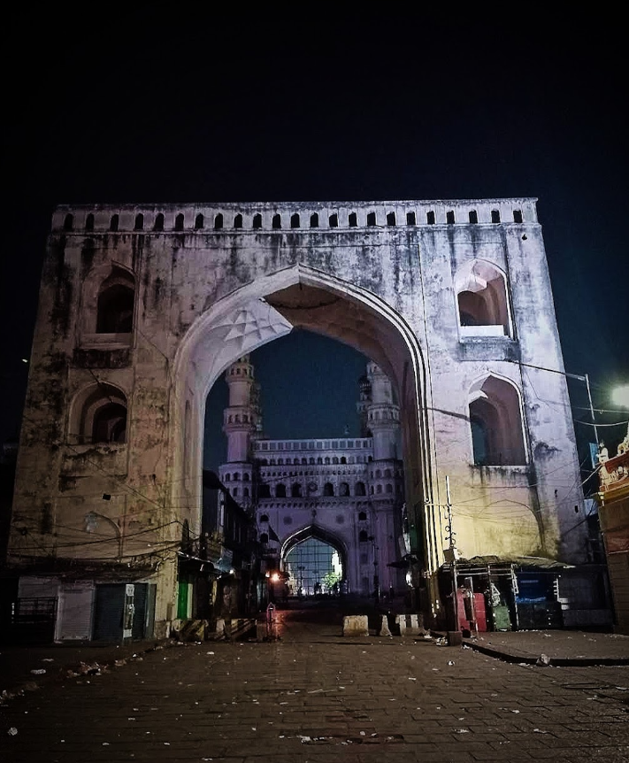 차르미나르는 1591년에 건설이 시작되어 1594년에 완공되었습니다. 당시의 왕인 쿠타브 샤히 왕조의 궁전 건축가가 설계한 이 건축물은 당시 하이데라바드의 중요한 교차로에 위치하여 상징적인 의미를 갖고 있었습니다. 전설에 의하면, 차르미나르는 당시 이 도시에서 발생한 전염병을 종식시키기 위해 지어졌다고 전해집니다. 네 개의 기둥 이라는 뜻을 지닌 차르미나르는 그 이름 그대로 네 개의 대형 아치가 인상적으로 배치되어 있습니다. 이 아치들은 하이데라바드 시내를 가로지르는 네 개의 주요 도로를 연결하는 구조적 의미를 내포하고 있습니다.