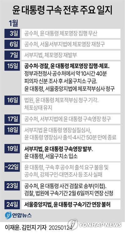 [2] 쿠키뉴스 - 법원, 윤석열 구속기간 연장 불허 檢 수사 계속할 이유 없다 (https://m.kukinews.com/article/view/kuk202501240200)