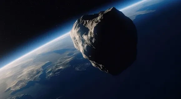이 이미지는 소행성이 지구로 다가오는 모습을 보여주고 있어, 실제로 이런 상황이 발생한다면 얼마나 긴장될지 상상해보게 해.